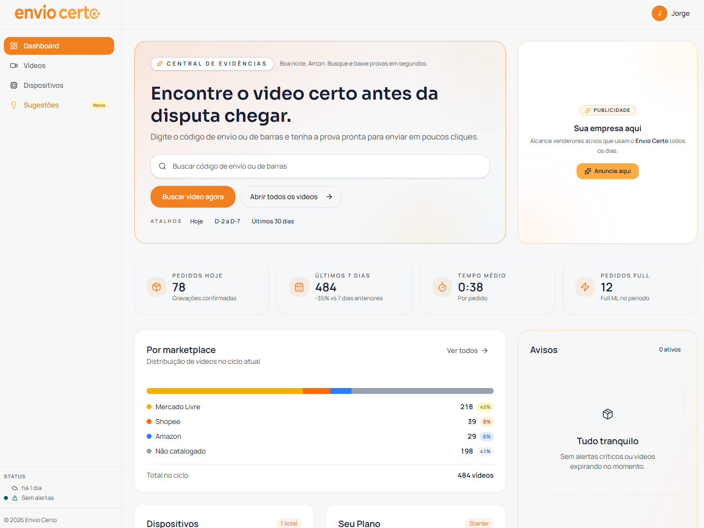 Sim! O Envio Certo funciona com qualquer marketplace. O app grava o vídeo vinculado ao código do pedido — independente da plataforma. Quando precisar, basta buscar pelo código e baixar o vídeo para enviar como prova na contestação.